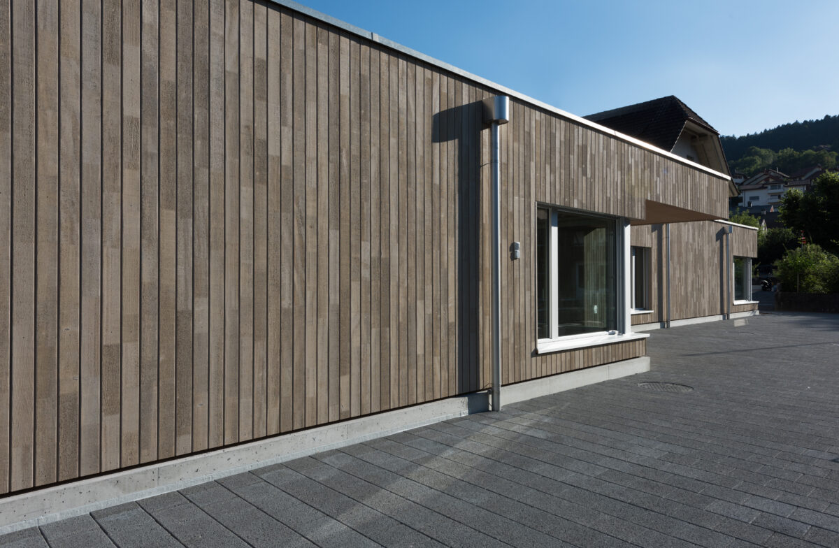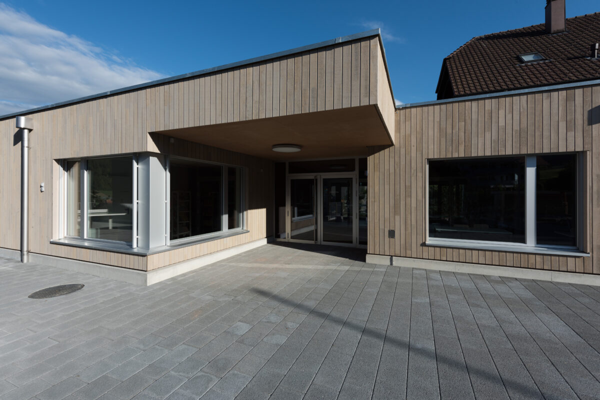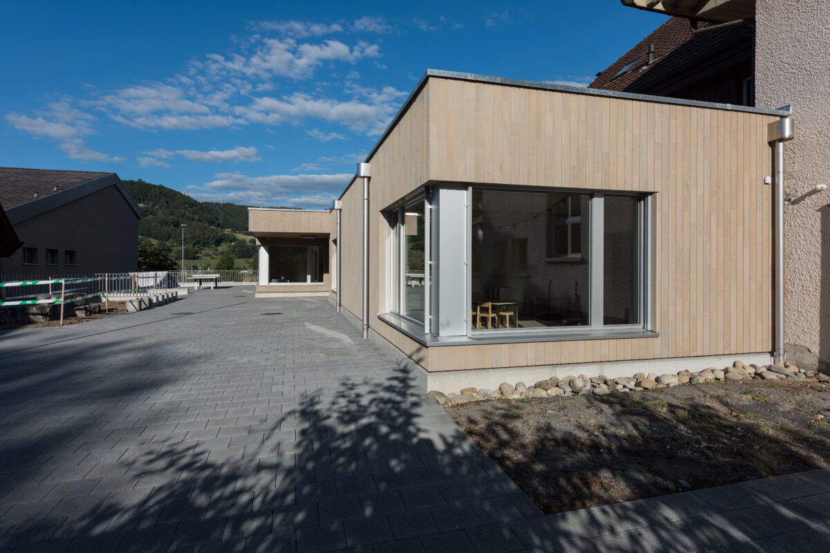 Ausgangspunkt des Projekts ist das Bedürfnis der Schule Kaufdorf nach zusätzlichen Räumen, um den heutigen Unterrichtsformen gerecht zu werden. Als Ergebnis ist neu ein moderner, eingeschossiger Holzkubus mit Betonsockel an das bestehende Schulhaus angedockt. Dieser erfüllt die Bedürfnisse am richtigen Ort und ordnet sich den Hauptbauten aus unterschiedlichen Zeitabschnitten unter. Im Erdgeschoss entstehen eine neue Tagesschule, eine Bibliothek sowie Gruppenräume. Im Sockelgeschoss ein zusätzliches Klassenzimmer und ein neuer Lehrerarbeitsbereich.